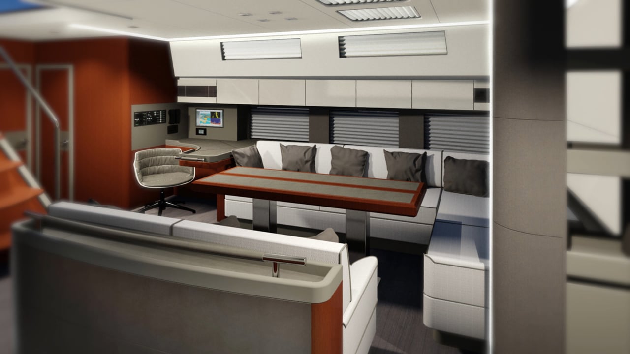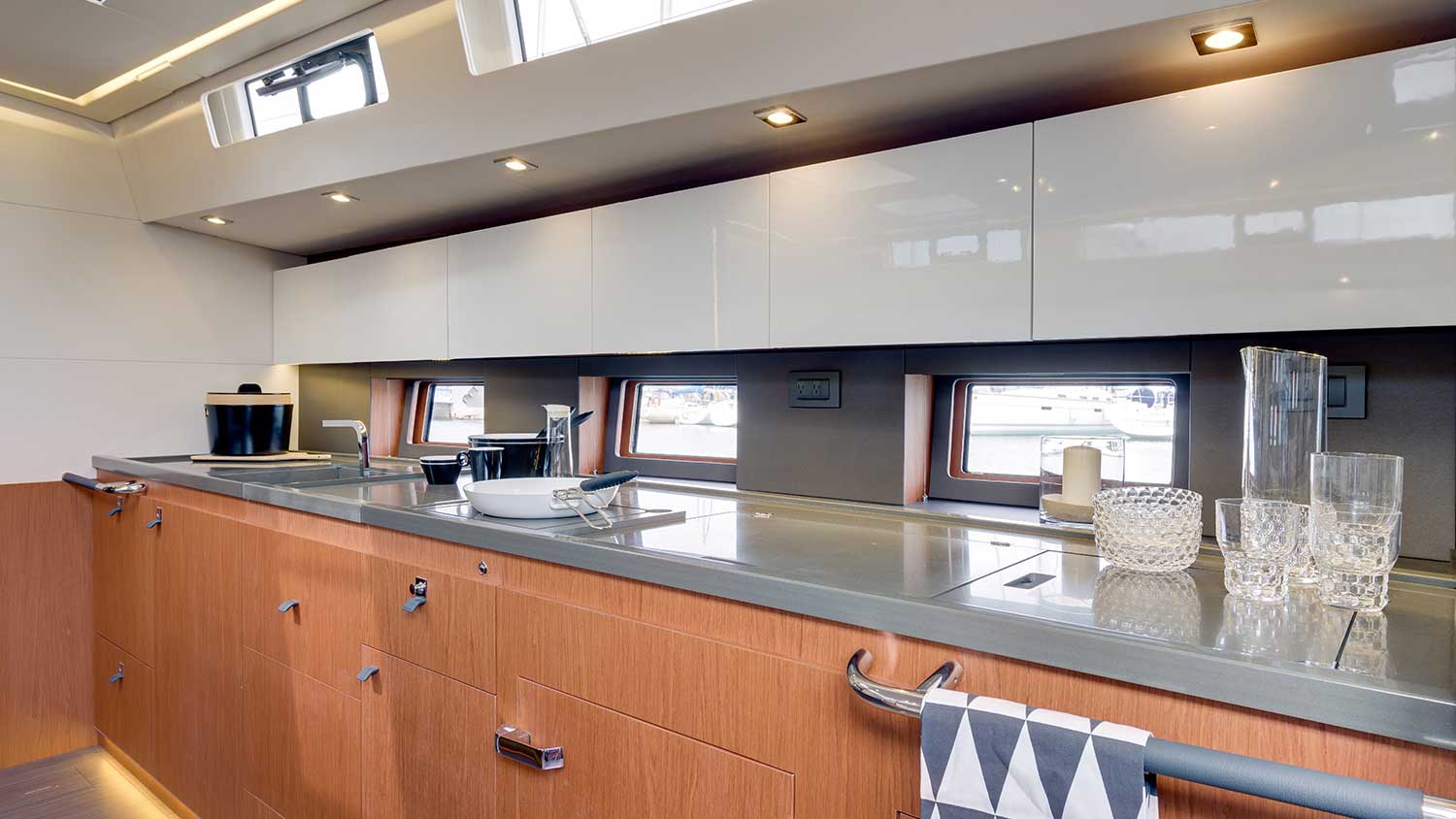 She has distinctive lines that stand out naturally under sail as well as at the marina. Her chined-hull is encircled by a band of large windows. Twin rudders and a perfectly centered sail plan give her the same maneuverability of a much smaller yacht. Her cockpit features an outdoor grill and sink plus a Bimini top for first-class entertaining. At the stern, a tender garage is flanked by stairs leading to a huge swim platform that doubles as a tender launch platform.