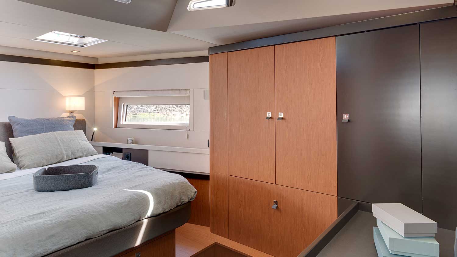 Below deck, the 62 features an enormous salon as well as many lavish and private spaces. Ambient light is plentiful thanks to many large windows and skylights, making already large spaces appear even larger. Ingenious design maximizes closet and storage spaces, so there is always room for extra belongings for longer cruises.